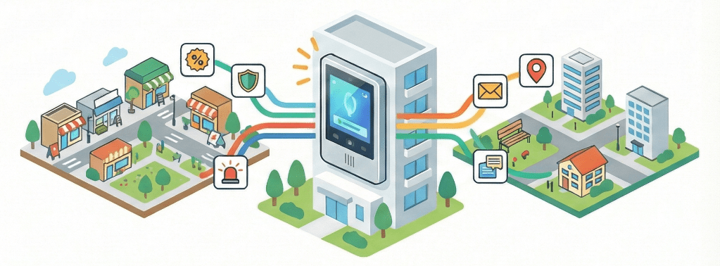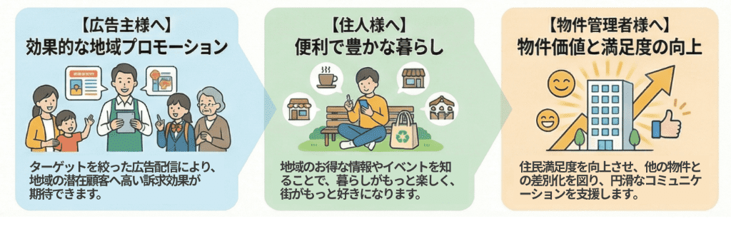 広告だけでなく、地域のイベント情報、生活に役立つ情報、防災情報など、住人に価値ある情報を提供します。