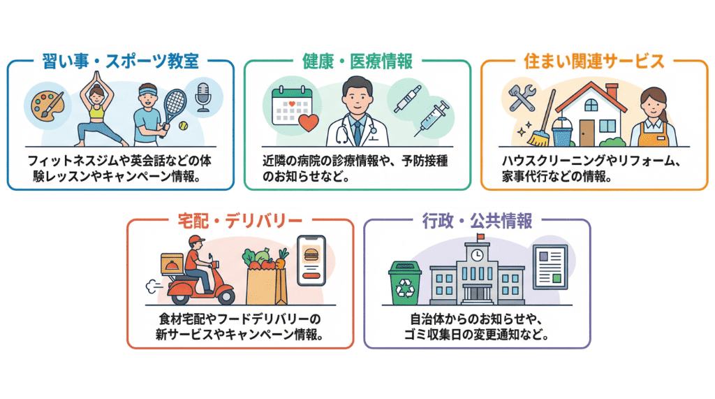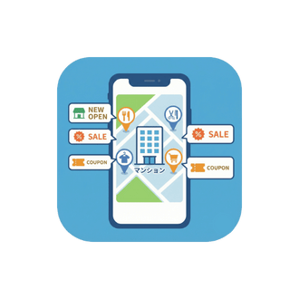 マンション周辺の飲食店、美容室、クリーニング店、スーパーマーケットなどの地域店舗が、ピンポイントで情報を配信。新規オープン、期間限定セール、クーポン配布など、住人にとって本当に価値のある情報だけをお届けします。